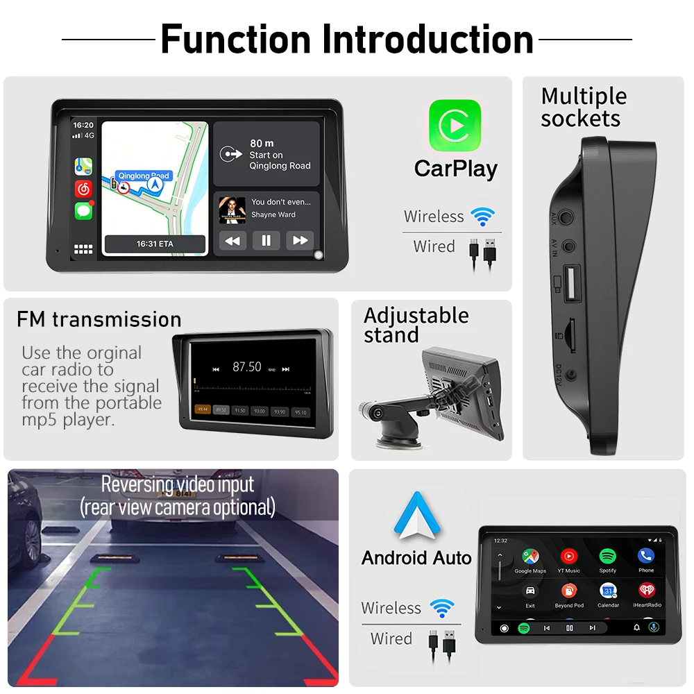 【AUX/FM Transmission Options】 The portable CarPlay display includes built-in speakers. For enhanced sound, you can transmit audio to your car speakers using either FM frequency synchronization or the included AUX cable connected to your car's AUX input jack.