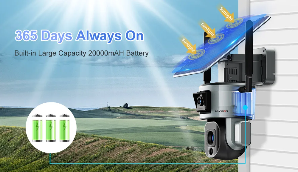 Under the same conditions of light, high -energy high -energy plates can convert solar energy into faster electricity.We are equipped 20,000 mAh high -capable rechargeable battery, more electricity can be stored, and more durable, thus ensuring that the camera will continue to work even at night when there is no light and in rainy days.
