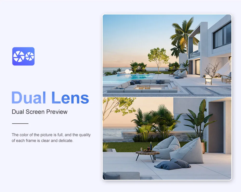 Monitor double cameras.One camera for global monitoring wide angle, one camera detailed.Our camera adopts 4K (8MP) image quality, the highest vertical accuracy, a higher level of details, a more clear view, clean and more sensitive, more overwhelming feeling, can effectively solve the need for high -definition image quality and light complex places of monitoring needs.