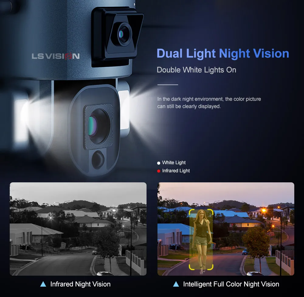 The full color camera feature is a strong night vision effect, even in any lighting, but also at all times to present a 4MP image.Night vision mode is equipped with full colors with a LED lamp to provide lighting for our return home.The lights are turned on only at night when the PTZ WiFi camera detects the movement of people or cars.